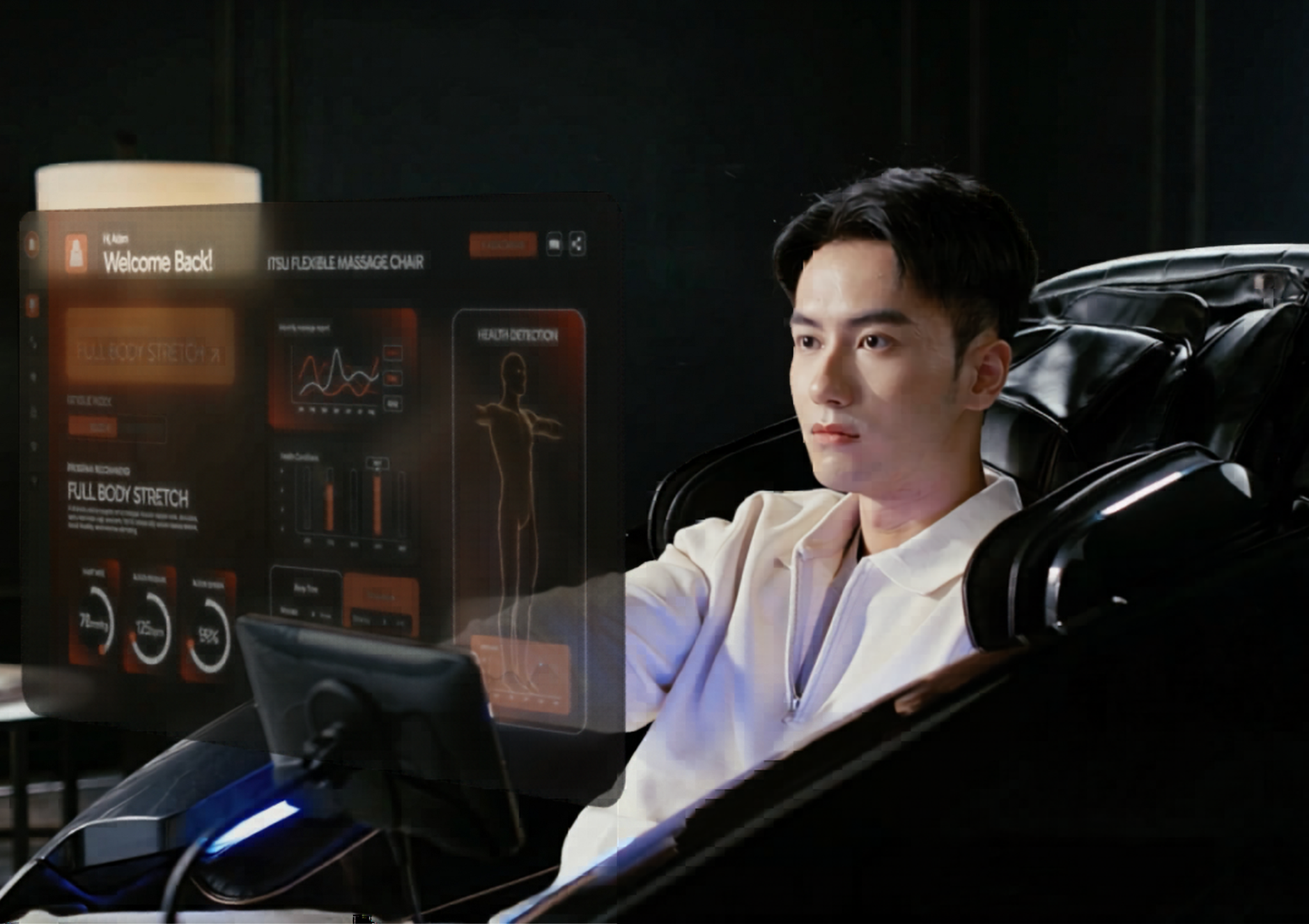That evening, after the family is settled, you sit down again. The Smart Band has tracked your day — your stress load, your sleep from the night before. The Pro Max understands the program your body needs. You don't choose. You just sit. Thirty minutes later, you are asleep and rested.